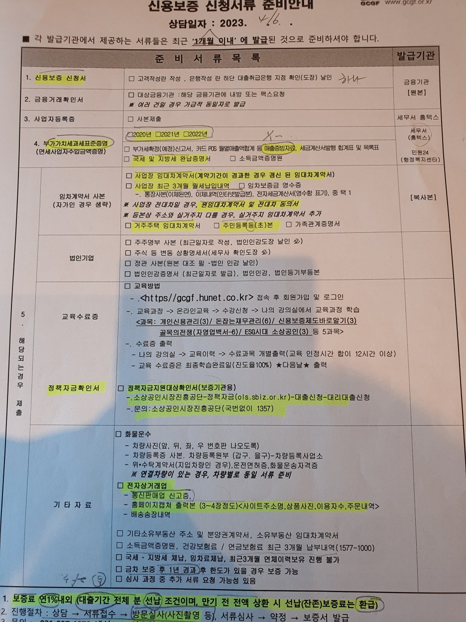 4/6(목) 나는 담보가 신용보증서였기 때문에 아래 서류들을 가지고 사업장 신용보증재단으로 갔다.