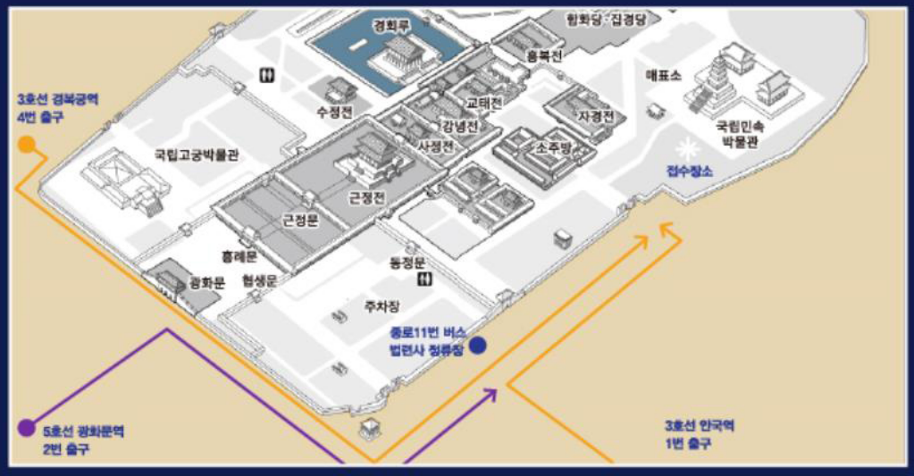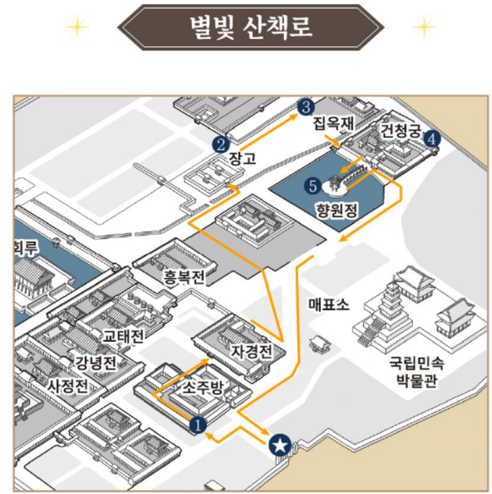 ①국립민속박물관 앞(집결) -> ②외소주방(궁증음식 체험 및 국악공연 관람) -> ③장고 -> ④집옥재.팔우정 ->