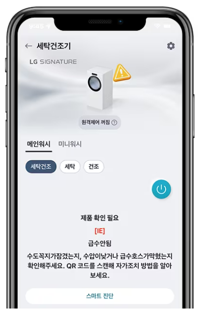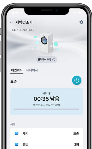 LG ThinQ App의 원격제어 기능을 활용하여 집이 아니어도 밖에서도 세탁기 제어가 가능해졌습니다. 또한 나의 세탁 형태와 세제사용량 확인이 가능합니다. 또한 세탁실에 들어가지 않고도 잔여 시간 확인이 가능하며 오류가 발생했을 시 어플로 즉각 확인이 가능해졌습니다.